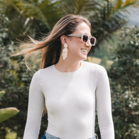 Los pendientes Fiji evocan la elegancia natural de las hojas tropicales, con un diseño alargado y orgánico que estiliza el rostro de forma sutil.