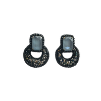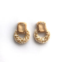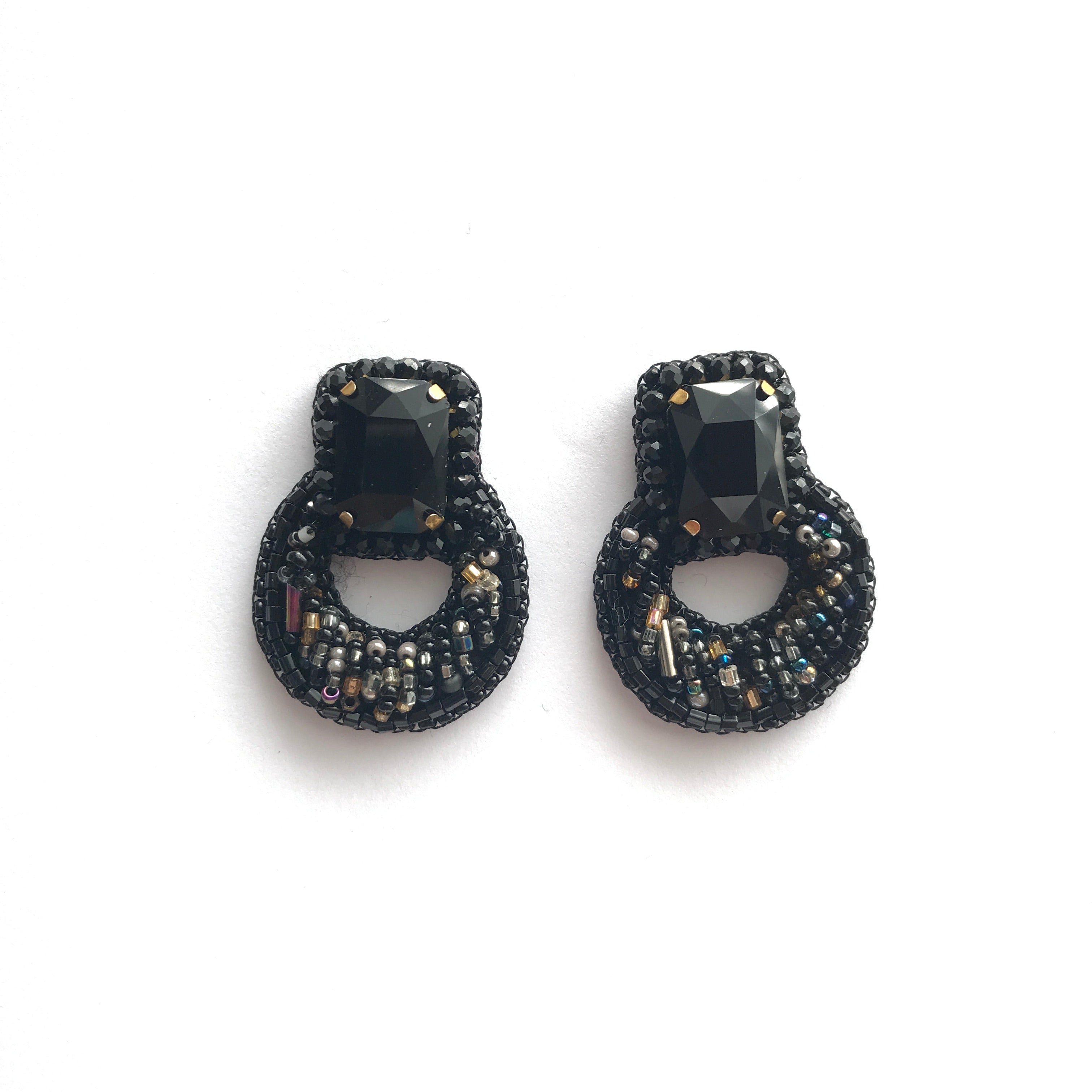 MAGNOLIA aretes de silueta envolvente y diseño atemporal. Están bordados 100% a mano con mostacillas de distintos tamaños y un cristal central rectangular que añade brillo y profundidad. Su forma curva se adapta con armonía al rostro, ofreciendo un efecto sofisticado y moderno.