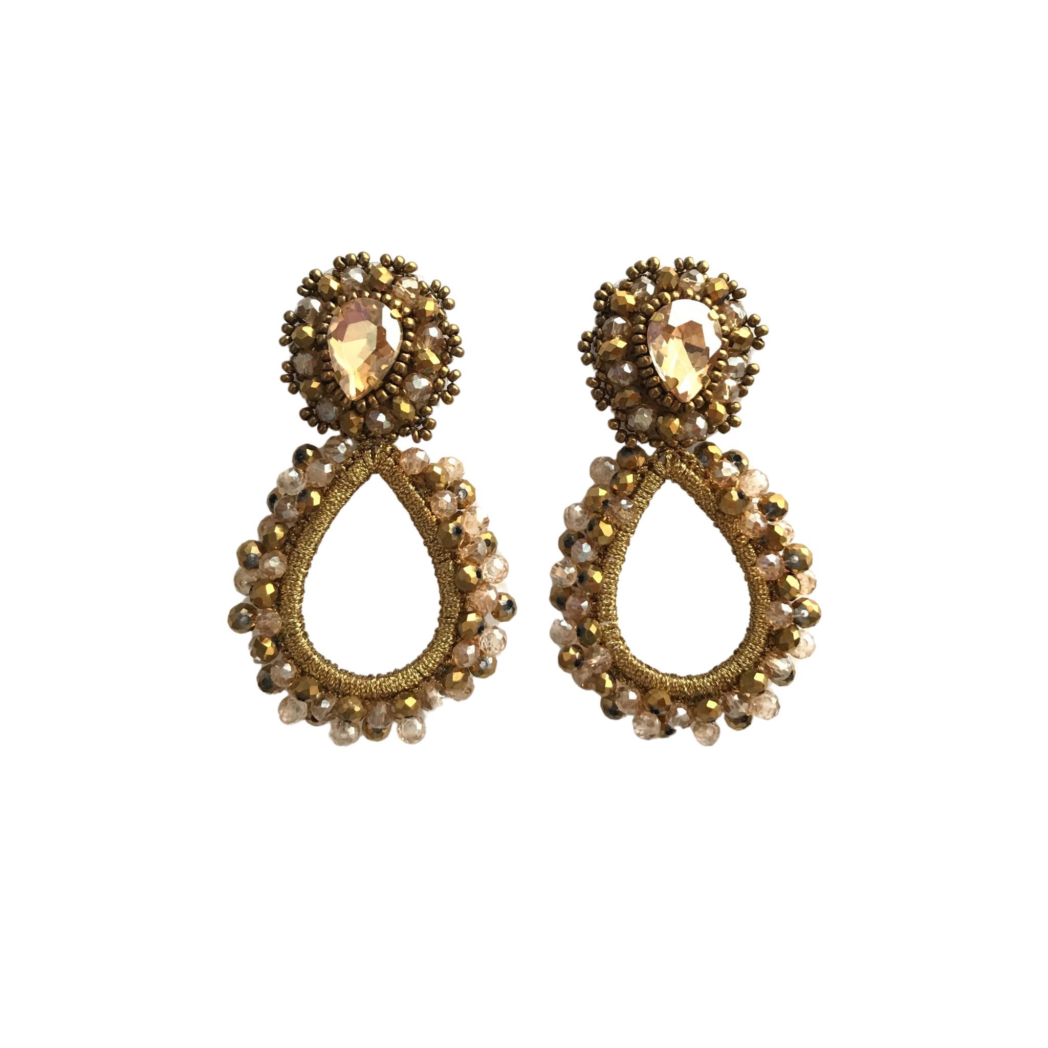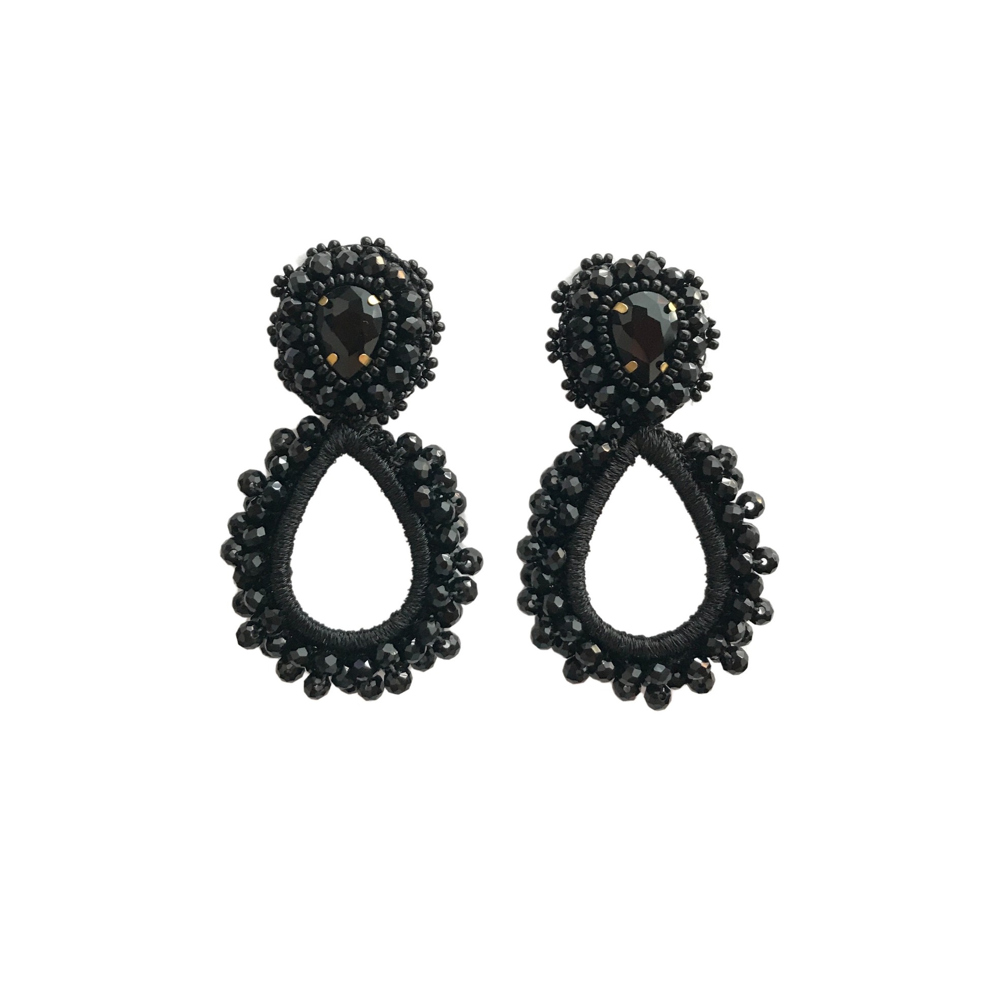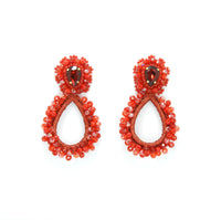 MAGDALENA L es una oda a la feminidad y al trabajo minucioso del bordado artesanal. Inspirados en la forma de una lágrima invertida, estos aretes combinan un cuerpo central calado con un contorno de cristales facetados y delicadas mostacillas que le dan profundidad y brillo sutil a cada movimiento.